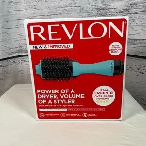 New in box but box is a little damaged product is brand new though not damaged Revlon Salon one step hairdryer in Volumizer Max drying power One step dry and volume 30% less frizz and helps reduce less damage