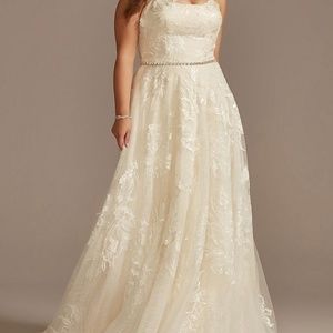 New Melissa Sweet Plus size wedding gown. This dress has been kept in the bridal bag since bringing home from the store. Have had bustle added to the train (A bustle refers to the process of transitioning a wedding gown to function as if it has no train by adding hidden buttons or hidden ribbon)