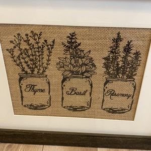Thyme basil rosemary in Mason jars, wood framed printed on burlap. Hung in my old kitchen, just moved and donβt have the space for it. Framed is rustic wood. 17β long x 14β high. Well made. Will be listing other art this week. Thanks for looking!π