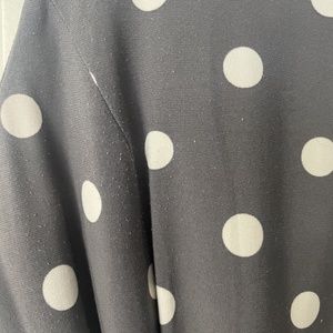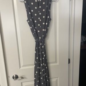 Used grey and white polka dot Ralph Lauren dress. 3/4 length, stretch material, belted, size 10. Some pilling- see photos.