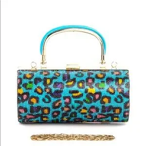 Teal & Orange Gold Chain Animal Print Rhinestone Top Handle Clutch