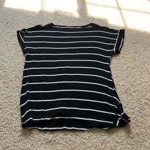 Great used condition black shirt with white stripes. Has a really cute tie on the lower front of the shirt (see photos). This is a Stitch Fix item, and has no “size tag” on it, but the shirt fits like a medium and has good stretch :). Super comfy ❤️