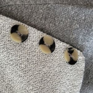 Open collar style shows contrasting light gray, textured inside fabric. 3 buttons are decorative.