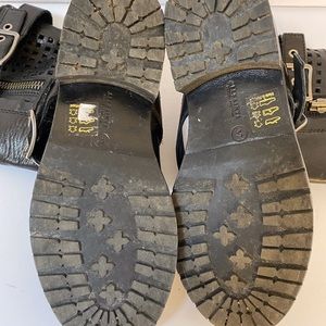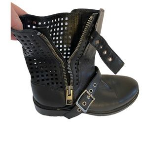 All Saints black leather ankle boots, size 37. Side zipper with workable buckles. Silver tone metal. Some wear, see pics. Overall very good condition.