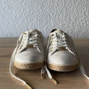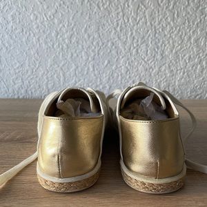 Cotton canvas/leather upper, Man made lining and sole. Imported. Round toe; lace up; metallic leather panels; espadrille detail.