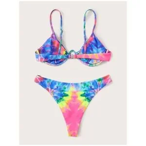 Colorful trendy multicolor tie dye underwire two piece bikini set with high cut style bottoms. Removable padding.