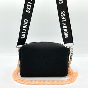 ✨I adorned this trousse w/a ~20” removable peach acrylic resin hand chain, a ~26”-48” adjustable length thin guitar style strap & custom D-rings to make this a crossbody bag. Can also be worn as a shoulder bag, bum / hip / waist bag, or front sling bag. Fully convertible design! Adornments are unbranded.
