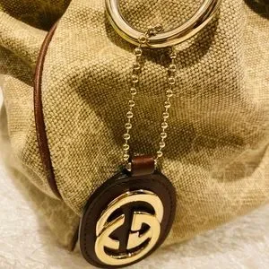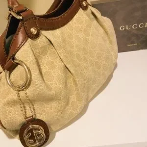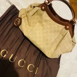 💕100% AUTHENTIC, Pre-loved GUCCI SUKEY medium tote! Absolutely GREAT Pre-Loved condition! Brown and cream colors! Linen lining inside! Attached GG charm! Adjustable sides & zippered interior pocket! Made in Italy!💕