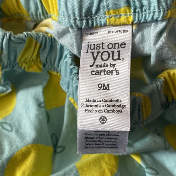 Adorable little outfit by Carter’s. A white and yellow stripe blouse with two embroidered lemon slices. A pair of shorts with a lemon print all over. More pastel in person. Both 100% cotton