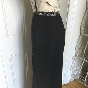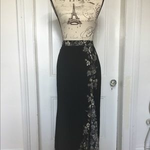 High slit on one side. There is a miniskirt lining. Fitted at the waist and hips, follows the body and flows to mermaid flare in the lower portion. Very nice fit.