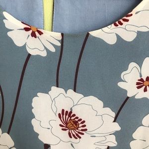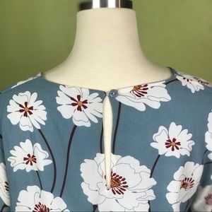 🔸 White Poppies on Powder Blue-Gray background. Keyhole button at back. Tiered Ruffled 3/4 sleeves. Lined. Hand Wash. Size not listed. See measurements.