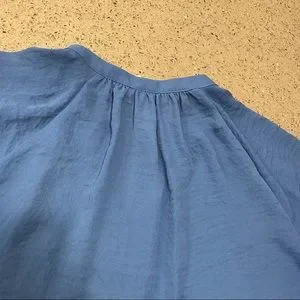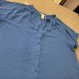 Button up. Small pleating at front shoulders and at back of shirt. Beautiful deep gem blue color. Looks amazing tied up with jeans or with a professional work outfit. I used it once to film in for a self tape outfit and the color was stunning. Great fit.