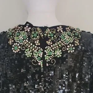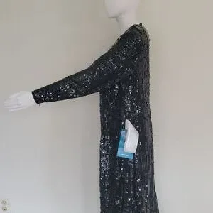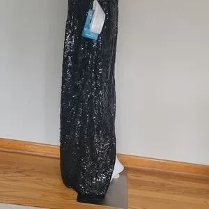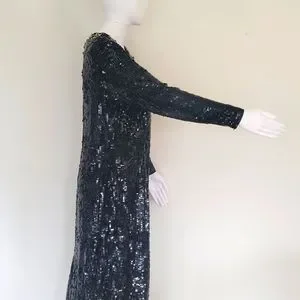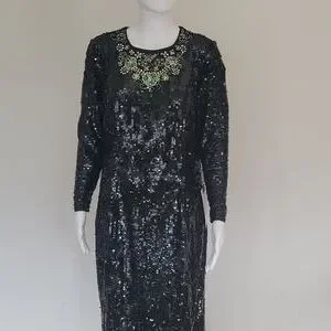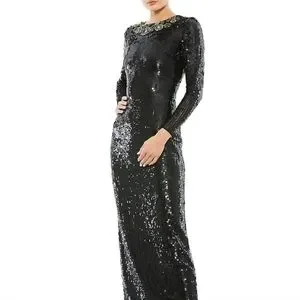 Designed with allover sequin detailing for liquid-like shine, this elegant column dress features delicate floral beading at the neck.