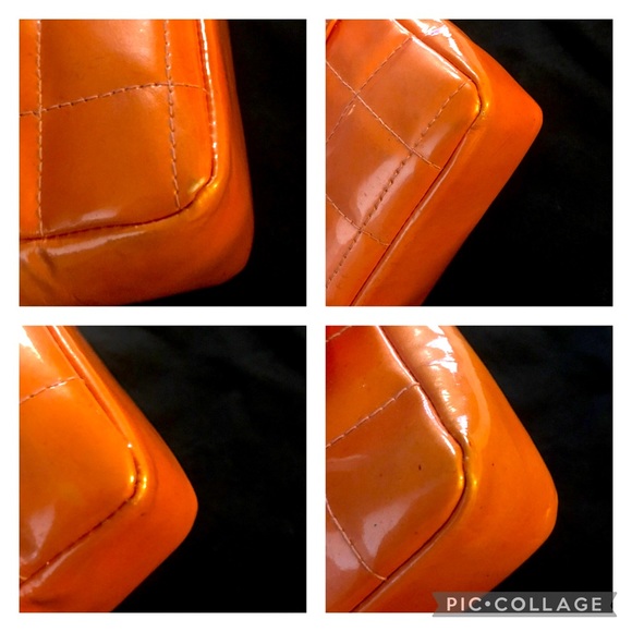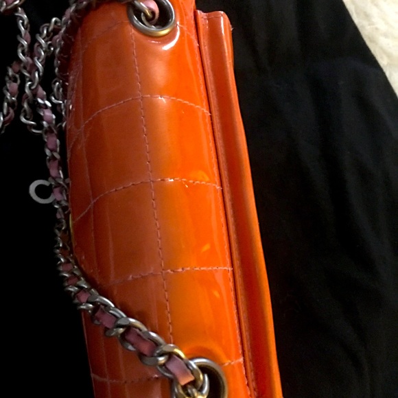AUTHENTIC- Ultra RARE CHANEL CC WAIST or CROSSBODY Flap- This Multi color Chanel Mini features a beautiful Dull ORANGE patent leather bar pattern BAG, it has YELLOW CC logo on flap, matching PINK interior- light stains & PINK leather through gunmetal chain strap. Exterior has a few discoloring / faded areas & slight scuffs on corners but not very noticeable, no tears. Has “FLOX” vintage Chanel hardware signature Snap closure, CHANEL serial no# & Stamps are visible - Made in France. No Authenticity card or box! Will include non Chanel dust bag & CERTIFICATE OF AUTHENTICITY!