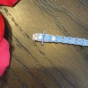 As you can see, this is an AMAZINGLY BEAUTIFUL TENNIS BRACELET!!! It is also affordable, because only you will know that it is made out of CZ’s instead of real Diamond’s, because they are so authentic looking! That is due to the fact that they are a quadrillion-cut. It makes them sparkle every time the light hits them! You will feel like a Princess in this bracelet!! It is an 8”, which is a L. It comes in a S-6 1/2 a 7 1/2-M and 8, which is the L, which is what this one is. If you are not super petite and like a lose bracelet, this will be perfect! Just letting you know, up front. I have a necklace in my store that would be pretty with it, if it hasn’t sold yet!