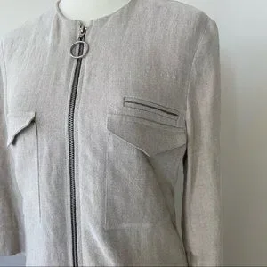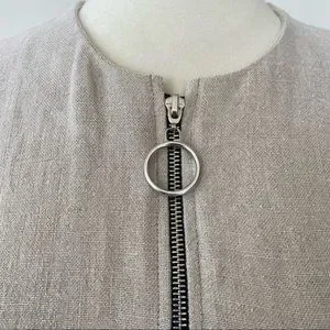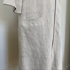 Features: three-quarter length sleeves; 2 flap pockets (chest); 2 deep, patch pockets (bottom, below hip); 1 besom pocket above the left flap pocket; 1 ring zipper pull; black contrast trim on the inside of the garment. The bottom zipper cannot and should not be unzipped; this is how the dress was made. The bottom zipper can be pulled up to give yourself a front slit feature.