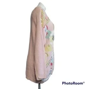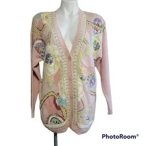 Vintage Chaus cardigan v- neck button up pastel pink with pastel colored designs shoulder pads 40" bust 31" long in very good condition