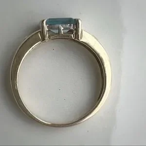 14 kt Gold Ring with Light Blue Aquamarine Baguette Cut Bezel Set w/2 Diamonds