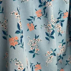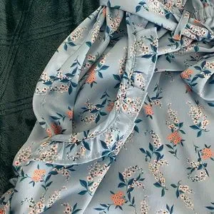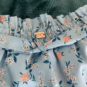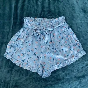 Adorable silky shorts with ruffles, belt tie, belt loops, and roomy pockets. For love and lemon. Light blue color with peach and white flowers and dark blue and teal leaves. Size small, could fit a small medium as well. I think they’re meant to be pajamas/lingerie, but they look cute out as well