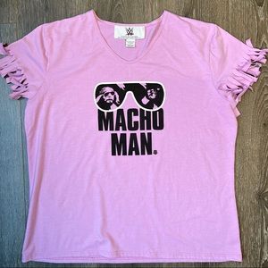 AWESOME Macho Man T-Shirt! 2019 Licensed, heather purple T-shirt with a front graphic design inspired by the late "Macho Man" Randy Savage. Short fringe sleeves, super soft 97% polyester 3% spandex