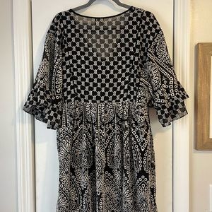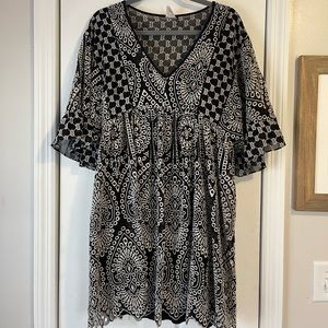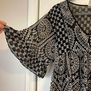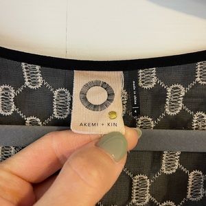 Super cute and gently loved, just ready to move on!! I bought a cotton slip dress to wear underneath since the eyelet pattern is sheer. The slip dress has adjustable tie straps and is a medium. It can be tied for a shorter or longer look depending on your height. Akemi & Kin label.