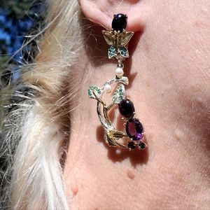 These are NEW STUNNING .925 Sterling silver set of fancy Floral chandelier earrings fresh off of my bench. This set has a MULTITUDE of stunning gemstones. Large beautiful Black Opals, Amethyst, small natural Pearl's, Aquamarine and Blue Kyanite decorate the fancy Floral style earrings. I've used 24k gold on the Floral accents and findings. Please ask questions and make an offer. I can't say yes if you don't ask!
