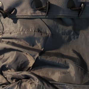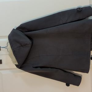 This is a Woman's size Small Charcoal Gray Coat that is lined. It has a fleece hood and two front pockets with a button detail on each sleeve. This jacket zips and also has 3 hook closures on the front as well.