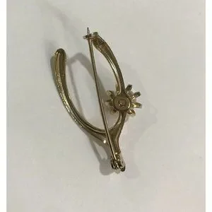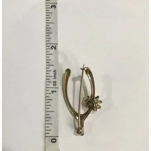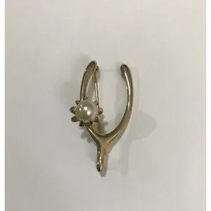 VINTAGE WISHBONE BROOCH GOOD LUCK SYMBOL GOLD TONE METAL PIN FAUX PEARL