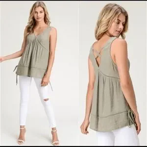 Details - dusty olive color, lightweight, romance boho style, cross cross back detail, casual roomy fit, rectangle eyelet detail cutouts