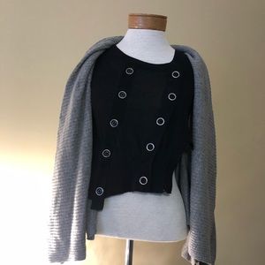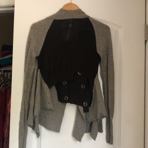 Unique and gorgeous lightweight sweater. Purchased in Manhattan an few years ago and only wore it a handful of times (maybe). The back is cut higher and the front flaps accentuate the silver buttons in front.