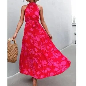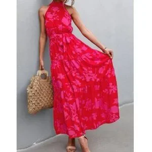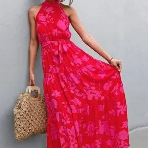 Boho floral print belted halter maxi dress - red pink