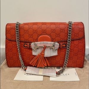 We have a different version with long tassels in orange tumbled leather. It’s never been used, and has linen lining with a beautiful plaid pattern. The interior has a zip pocket and divided interior. The orange is stunning as well. We also have it in all black, and quite a few colors with a top handle and a bamboo turn lock. Feel free to browse- if you want this one, let us know a budget, and we can likely source it for you.