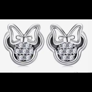 DAINTY 925 SILVER AND ZIRCONIA MINNIE MOUSE EARRINGS. MINNIE MOUSE HEAD SILHOUETTE WITH BOW. THE FACE IS DAZZLED WITH DAINTY ZIRCONIAS AND THE BOW IS A HOLLOW SILHOUETTE. HIGH QUALITY 925 & CZ Minnie Mouse Stud Earrings