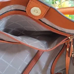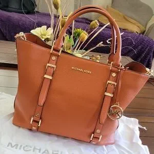 I love this bag, but it's just top big for my style. burnt orange and in great condition. authentic Michael Kors bag. very gently used, a few small blemishes to the underside of the shoulder straps. removable long strap. comes with the removable card holder too, which was bought lseparately to match. measures 13" long, 11" high, 6" wide. straps 6" shirt and the long up to 21". comes with dust bag.