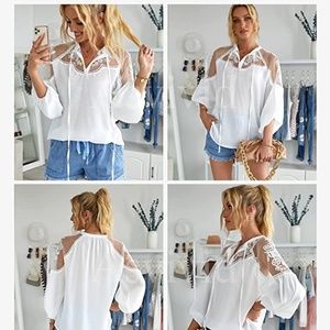 Sexy fun boho chic trendy lace accent blouse is perfect for day to evening wear. A lightweight oversized boho fit with front tie accents and gorgeous lantern sleeve design. Wear tucked in or over leggings or skinny jeans for an eye catching look. Lovely hi lo design. Measurements small bust 44”….length front 28.5…..length back 45”….Measurements on medium….bust 46”….length in front 29”….length in back 47”