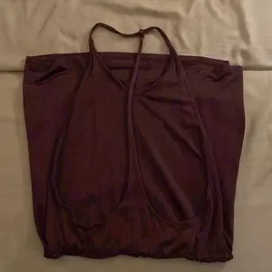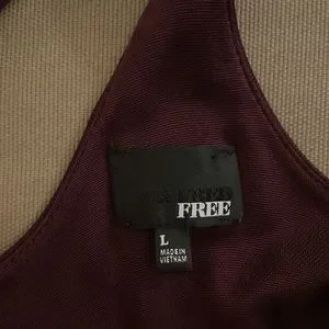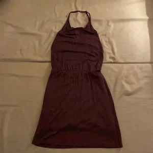 Worn once. Burgundy mini dress, low back with t strap at neck. Elastic waist. Mid thigh on 5’8 height.