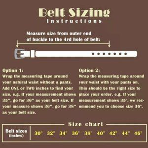 SIZE: 1 1/4" belt width; strap trim to fit up to 42"; 3 1/4" x 1 3/5" zinc reversible buckle.