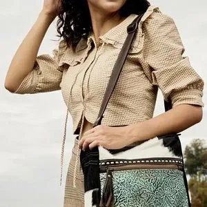 With this mixed textured patterned shoulder bag -you can take on a stylish look that transports you to a western meets Boho chic look. Sure to bring admiring comments while defining your own personal style.