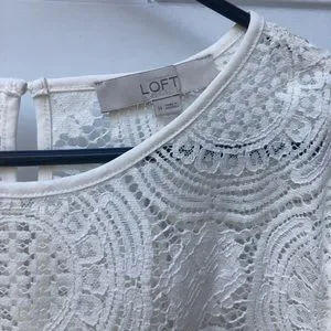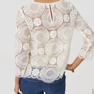 Medallion Patterned. Ivory White. Keyhole Back. 3/4 Sleeve-Long Sleeve. 19” pit-pit, 26” long. 66% cotton, 34% Nylon. NEW