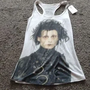 This brand new Edward Sciscorhands racerback tank is perfect for any fan of the movie or super unique characters! Capturing the face of the man brought to life from the mind of an inventor with the ability to turn a bunch of metal from an assembly line into a being so special and unique just like any of us, with especially unique scissor hands! Super comfy and ready to wear just take the tags off! Help find Edward his forever home!
