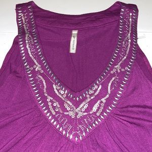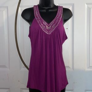 Grape colored tank top with silver studs, embroidery and sequins embellishing v-neck design. Mini pleating on bodice. Hemline rounded in front. Excellent condition.