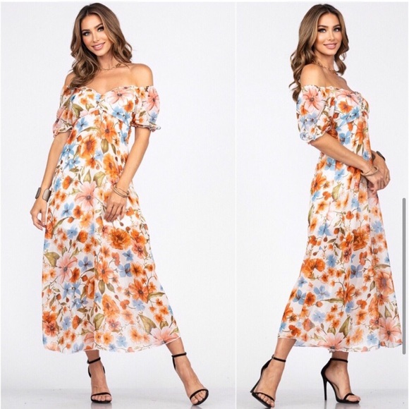 Details - beautiful empire waist, chirred flattering breast line, puff short sleeves, ultra soft half lining, stunning colorful floral print, off white color, off shoulder design, ankle maxi length, relaxed fit