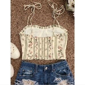 Size small cottagecore crop top. Ties at shoulders ruched back with zip closure. Sage green and cream. Floral vintage inspired pattern.