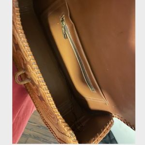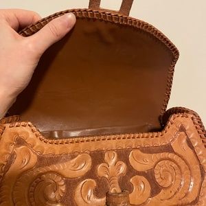 This boho/chic western inspired leather bag has a structured style. The strap is adjustable and can wither be worn as a cross body or shoulder bag. THE bag is in great condition, interior is clean and mark free. Front is pristine with a pressed and engraved beautiful/intricate flower design. Back of the bag also features pressed leather. small stain on exterior back right of bag (small darker brown splotch). This bag has a spacious interior with small side zip pocket.