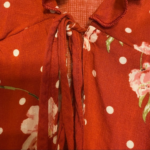 Ruffle around neck & front, The tie in middle is the closure of the blouse,
