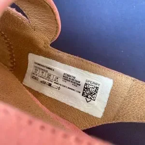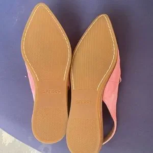 Sperry top-sider slingback sandals. Pointed toe. The cutest little sandals. And the color is adorable. These look like they have not been worn at all. No wear to insole or bottom of shoes. I did clean a small dirt spot off of the suede, but they look great.