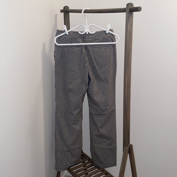 Fashion printed midrise bootcut pant. Black and white checkered print all throughout. Some stretch, button, hook and zipper closure on front side. 2 side pockets on front side, 2 back pockets. Orange strip located on inside by waistline, added colour for an extra pop! Gently used, in good condition. Inseam measures 31”.