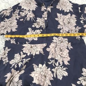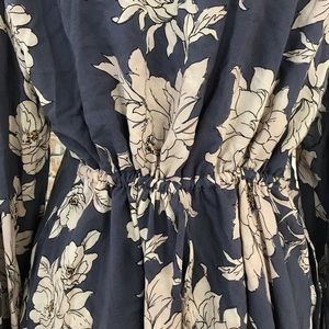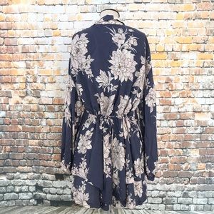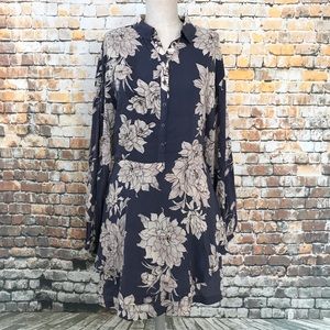 A back tie drawstring creates a flattering fit on a woven floral shirtdress with drop shoulders and an overlay skirt. - Spread collar - Long sleeves - Partial front button closure - Back tie drawstring