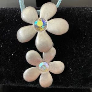 Lia Sophia 2 silver flowers with rhinestone centers on a baby blue leather cord.