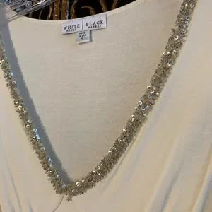 EUC, size Small, I am orig owner. Has sequins around the v-neckline. Approx 20.5” long from shoulder to bottom hem, bust 16”, sleeves 17”. Unsure of the fabric, but it's very stretchy. OBO MAKE AN OFFER.